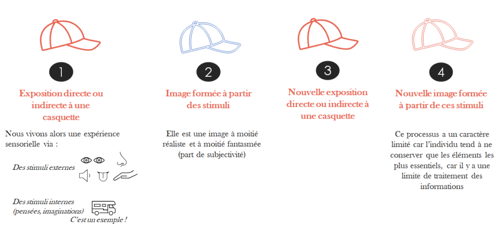 Très schématiquement, elle est produite à partir de nos perceptions (stimuli) et du traitement que nous en faisons. Ce processus s’appelle « l’imagerie ». Exemple :
